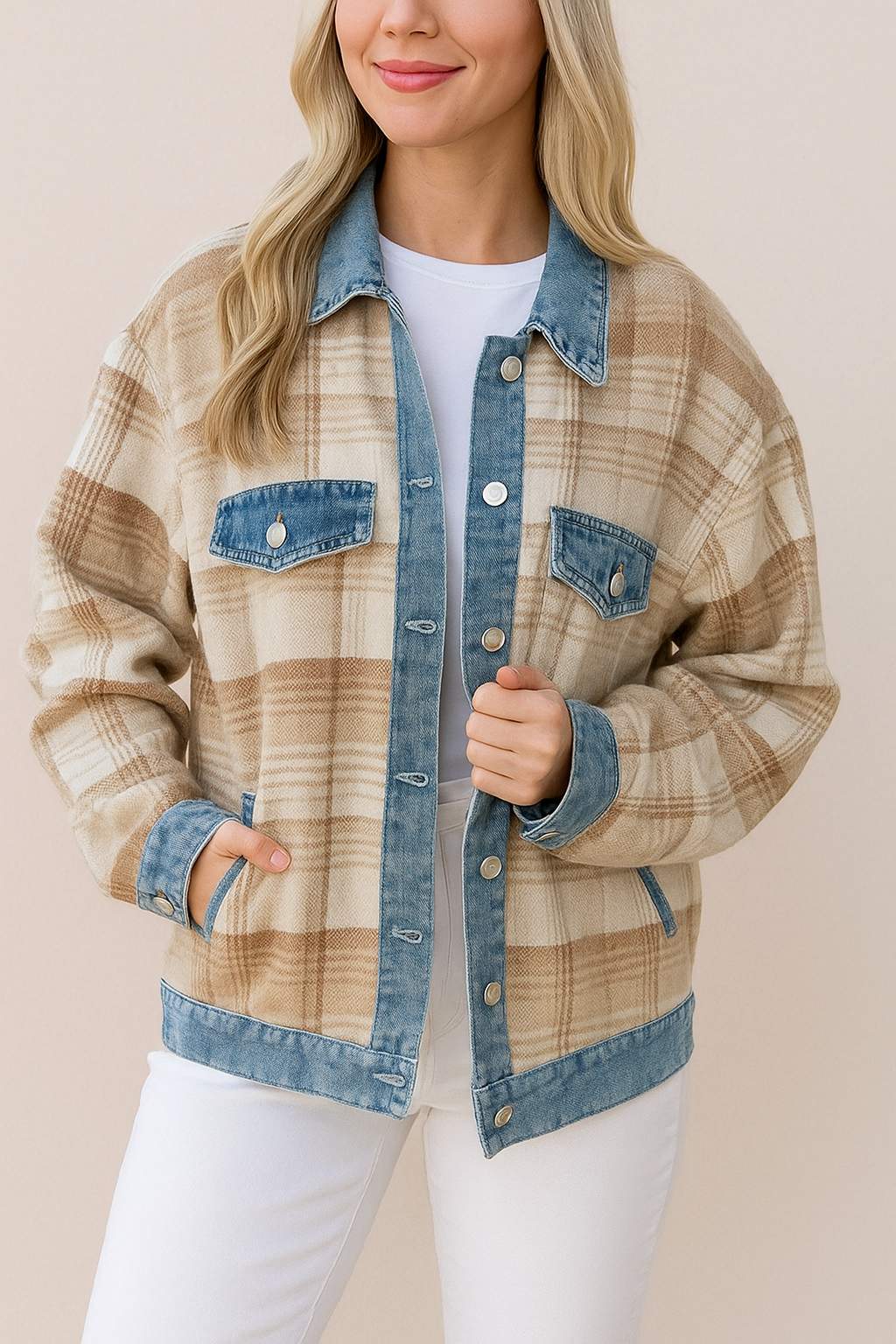 Meet your go-to layer: a plaid shacket finished with denim collar, placket, cuffs and hem for a fresh, mixed-media look. The relaxed, straight cut slips easily over tees and knits, while chest flap pockets and side hand pockets keep it practical. An effortless piece for transitional weather and weekend outfits.