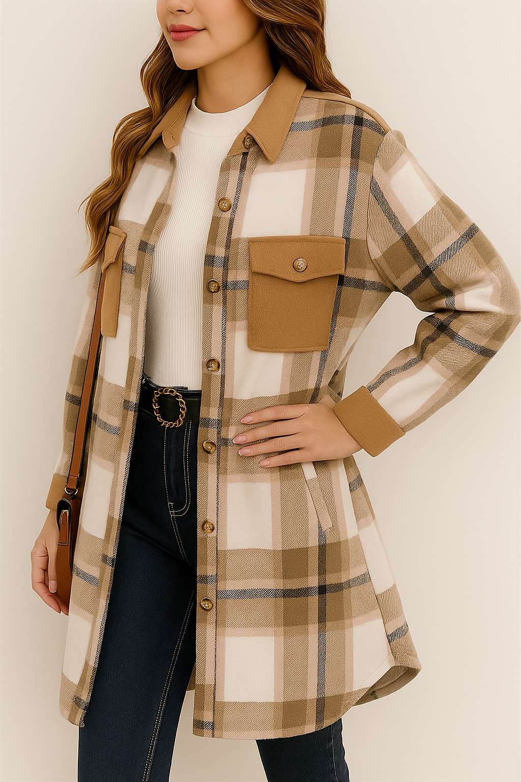 The neutral plaid pattern adds a timeless touch, while the mid-thigh length offers perfect coverage and a flattering silhouette. Whether layered over a basic tee or a chunky knit, this coat is your go-to for style and warmth—without bulk.